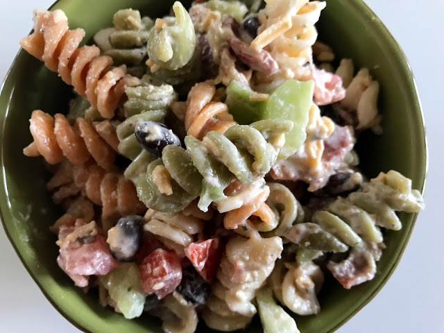 In a large bowl add the pasta, tomato, cucumber, black beans and shredded cheese. Toss with dressing. Salt, pepper and season to taste. Chill before serving.