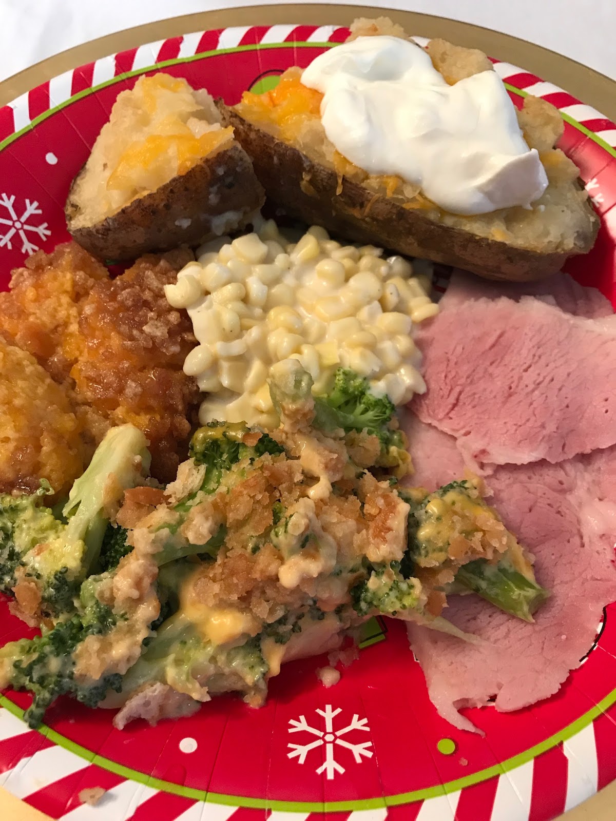 Ham off the bone, twice baked potatoes, broccoli cheese casserole, creamed corn, squash cinnamon casserole and not pictured….pretzel Jello salad, rolls and eggnog bundt cake.