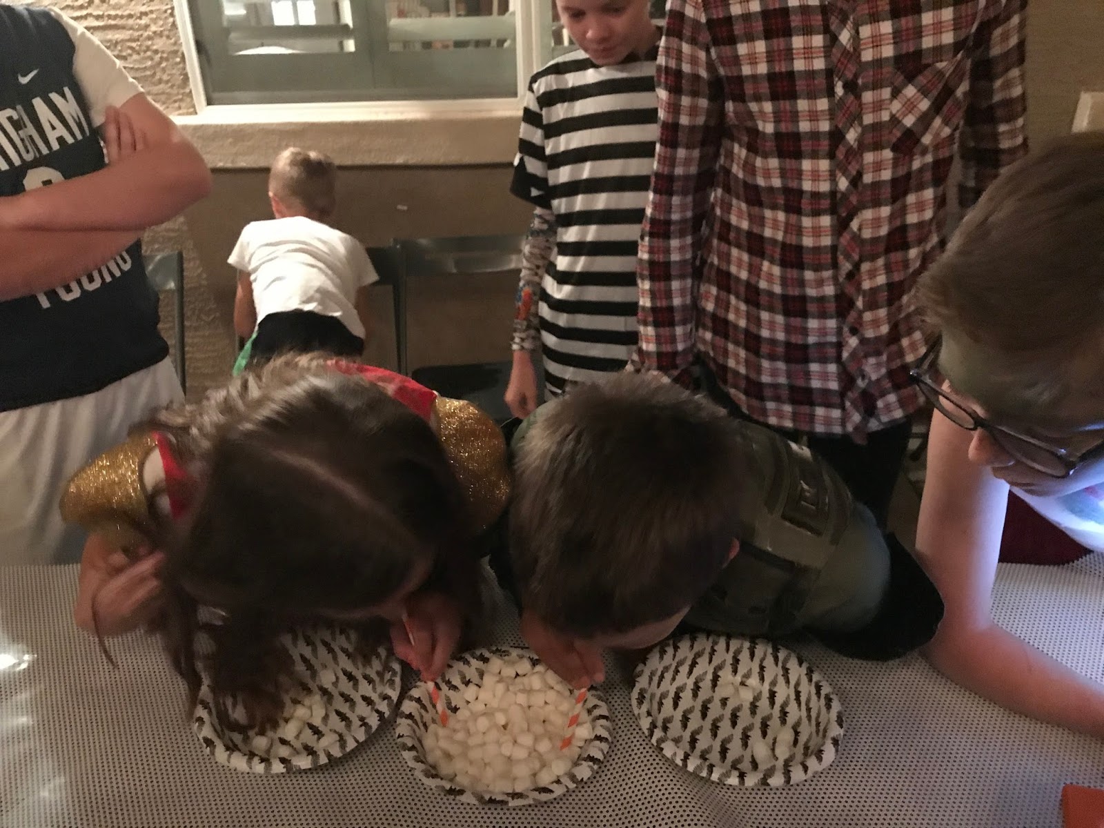 Whoever could suck up the MOST ghost boogers {marshmallows} with their straws and put them into their other bowls, won! Players had 30 seconds.