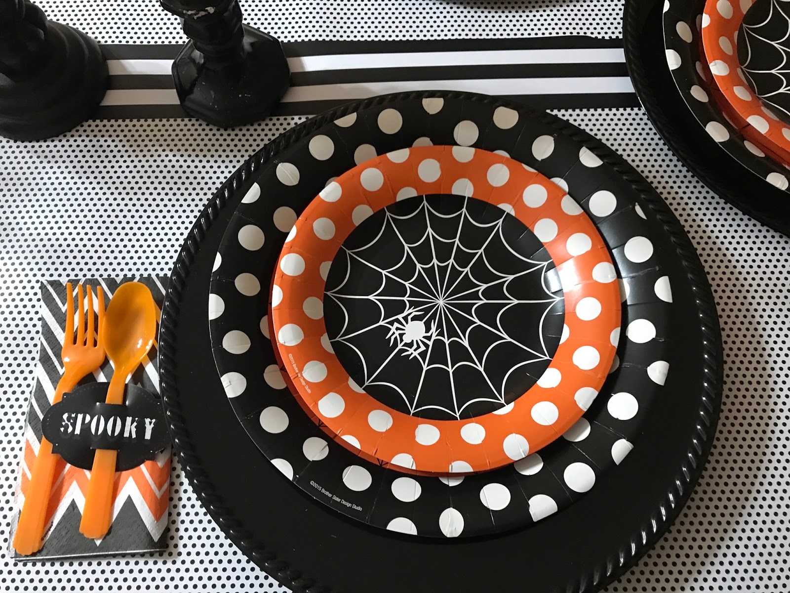 I used polka dot Hobby Lobby wrapping paper as my table covers. I strung paper ribbon down the middle….