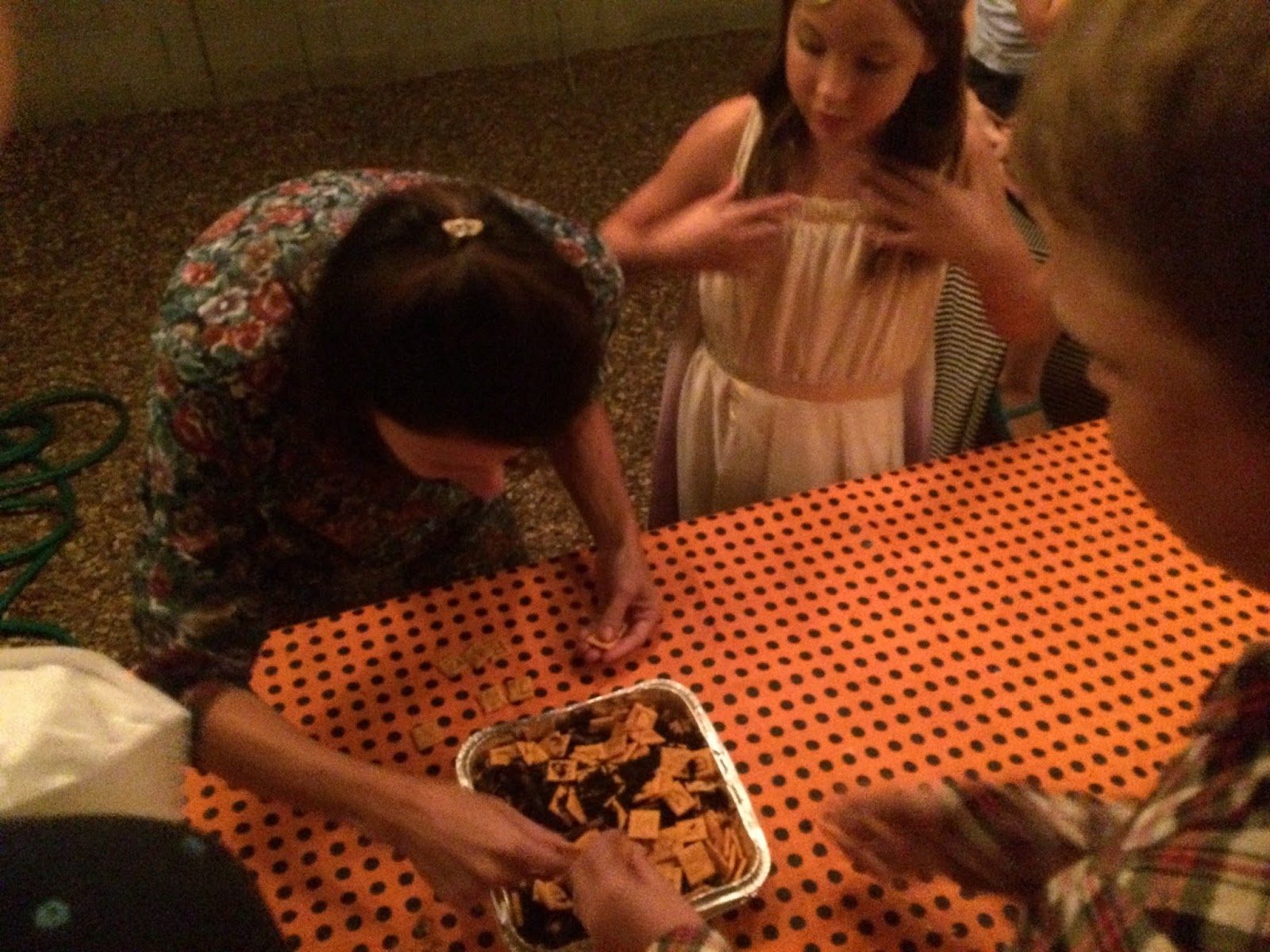 One person from each team must sift through the slugs and worms to spell out wordes with the alphabet crackers {Cheeze-Itz found at Wal-mart}. Words must be more than 2 letters long. The team to spell the MOST words in 1 minutes wins 20 points.