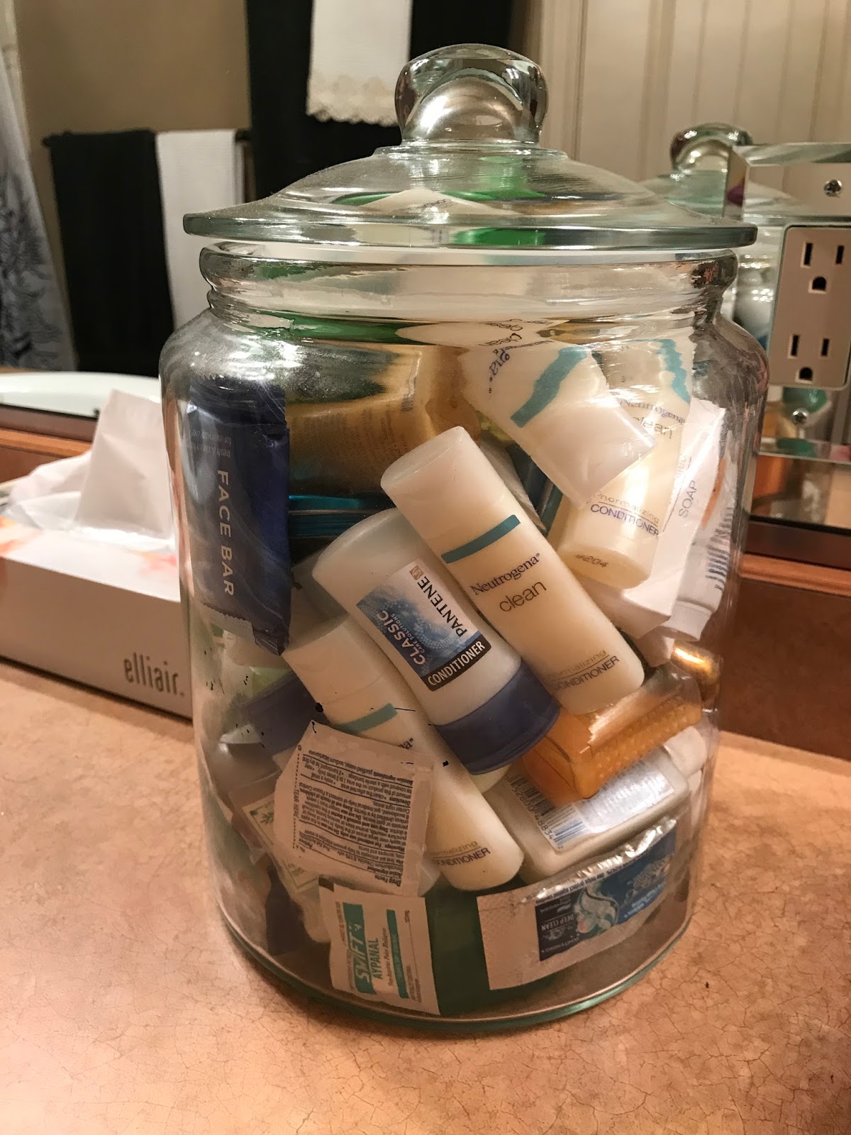 I totally have almost that exact same jar in my guest room. Also at Walmart in the cosmetic department they have ' travel kits for men and women here they are about $5.. they have shampoo conditioner, deodorant, toothpaste and brush and lotion etc… I buy one of each to top them up.. much cheaper than buying individually…and then I add things like tums, tampons, makeup wipes, floss etc.. I have a cute picture that says the WiFi password and a note saying to help themselves to anything they forgot.