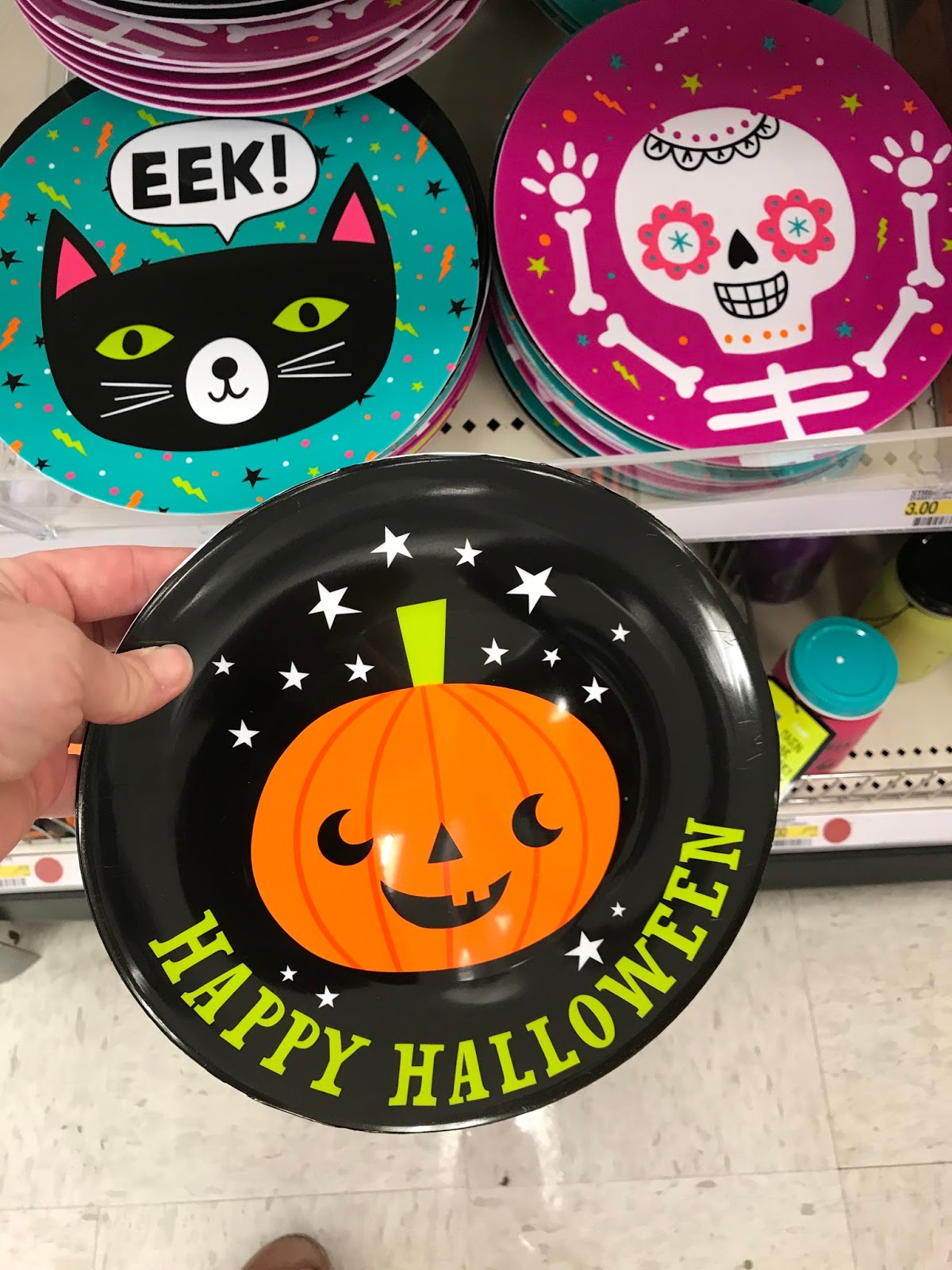 These cute, melamine Halloween plates are only $1 and they’re the PERFECT litle boogers to stock up on and deliver treats with throughout the whole month of October.