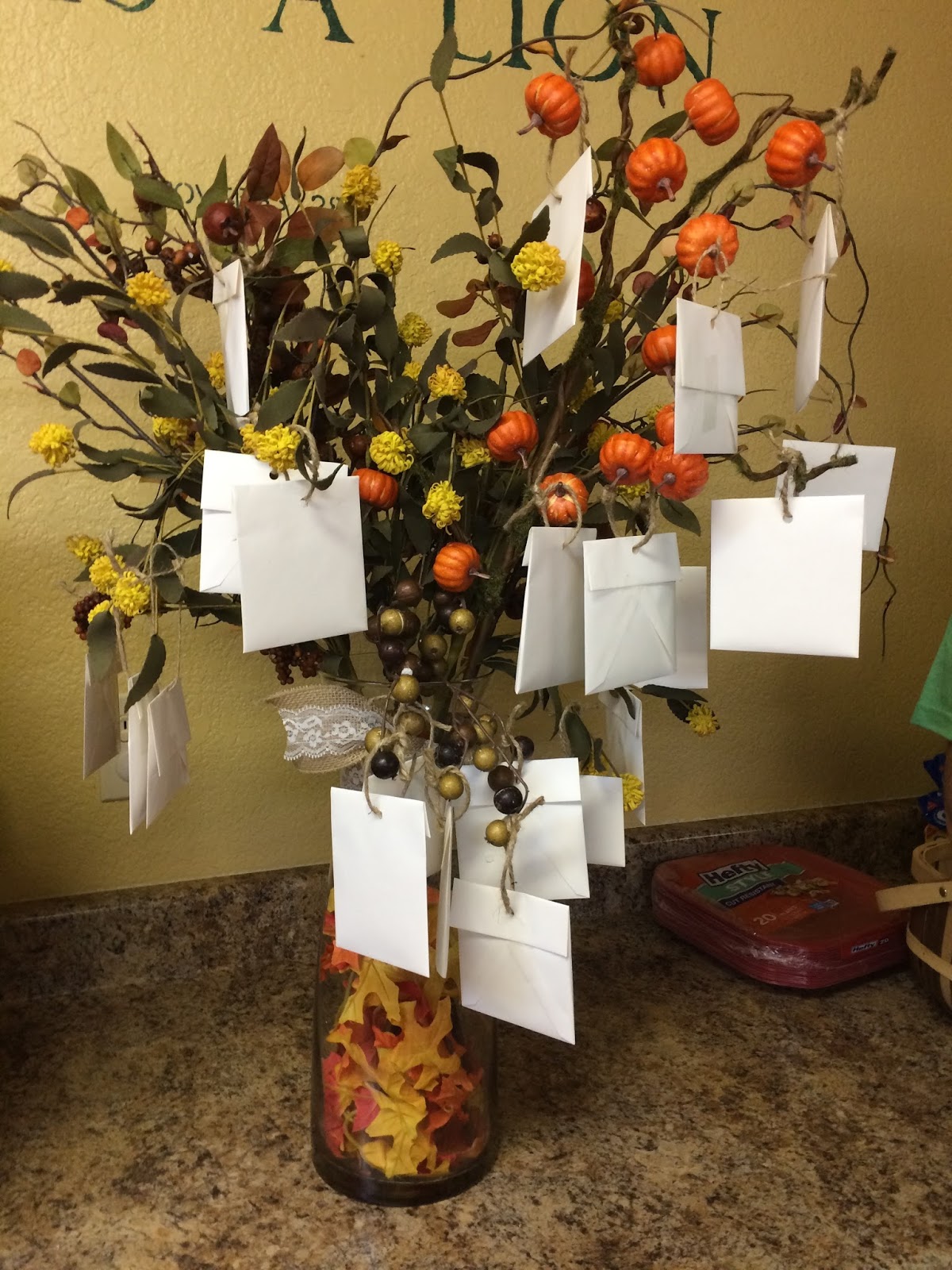 While they ate dinner, I called each one up and had them tell the group ONE thing that they were thankful for. Then, they were able to pick an envelope off of the tree to keep.