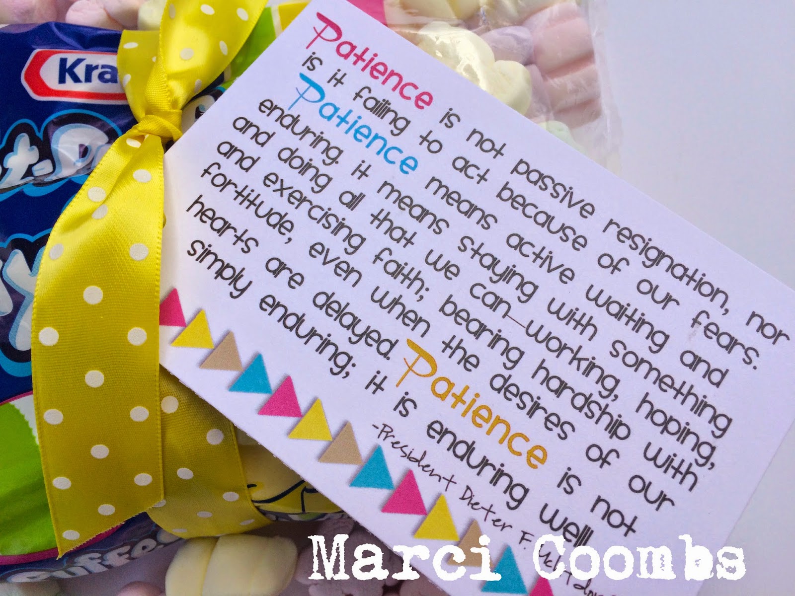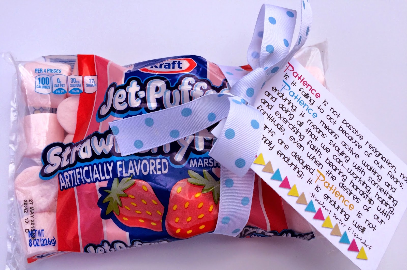 I admit, I read the patience tag and saw the marshmallows in the pic and couldn't figure out how you connected the 2.. BUT… I knew you had to have some brilliant way of doing it, so I quickly kept reading and found out how! I LOVE your monthly ideas and I am thrilled when I get to share them with women in our ward. ๐ Thank you!!