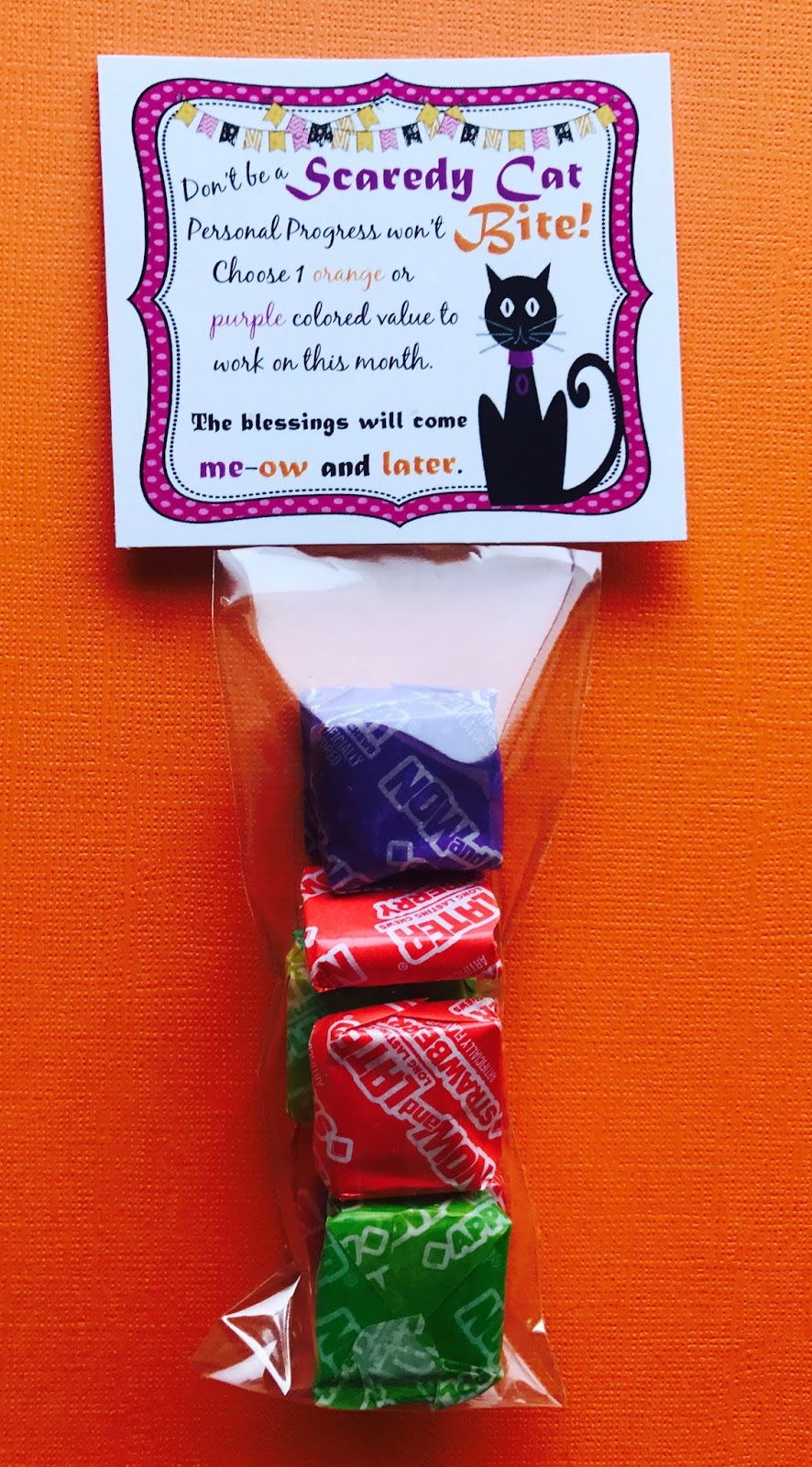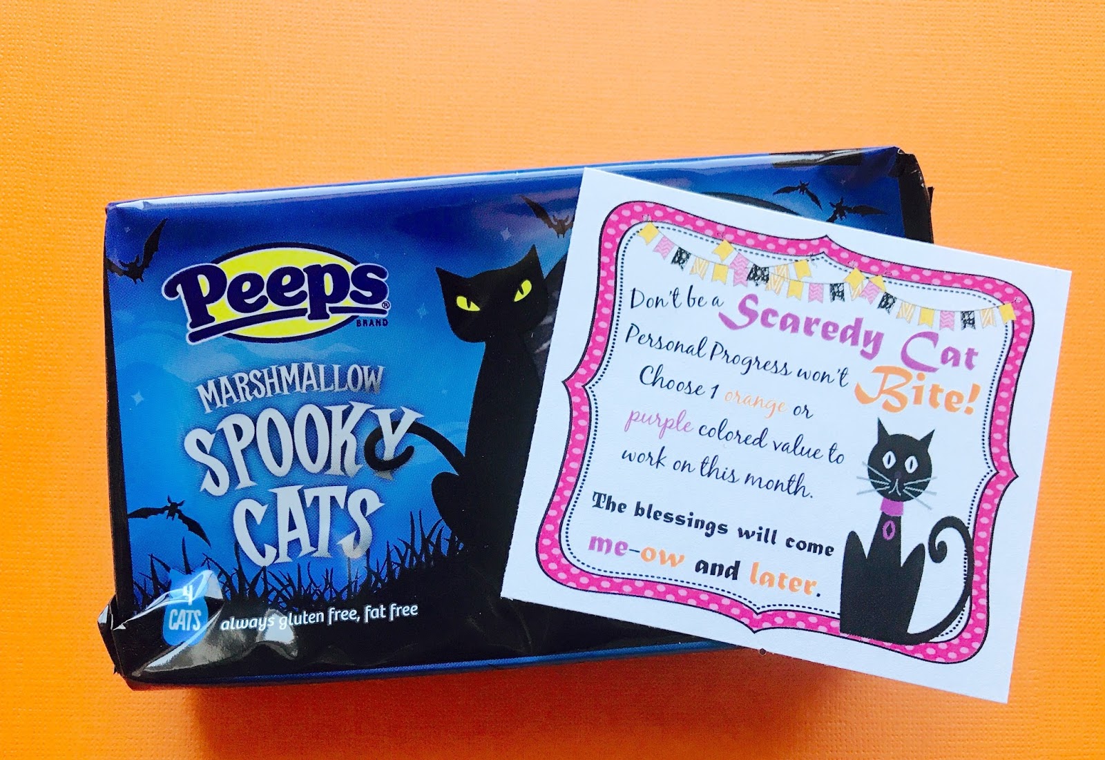 Download these Scaredy Cat tags HERE and attach em to Now and Laters, marshmallow cat Peeps or ANYTHING Halloween-y!