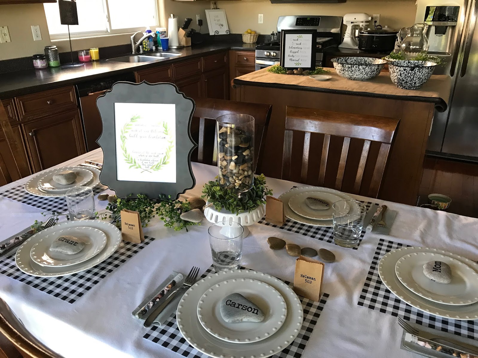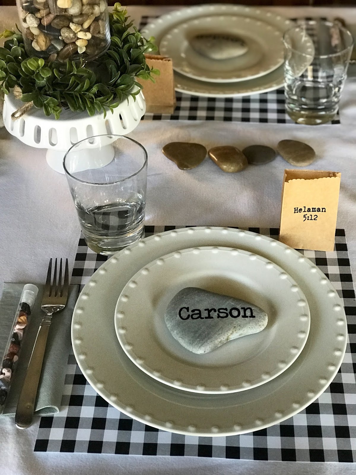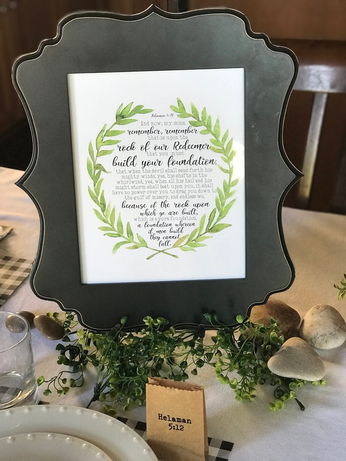 Each place setting had a large rock on it with each member of the family’s name on the front – – and a scriptural reference of our theme on the back.
