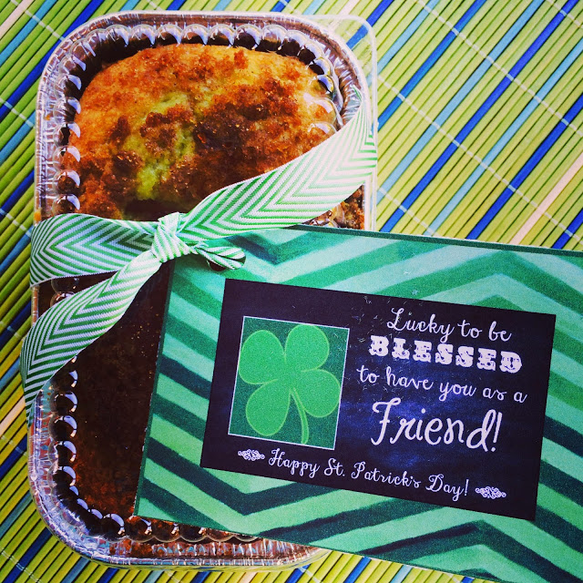 It turns GREEN {from the pistachio pudding} and it’s the PERFECT little something to bring to neighbors and friends for St. Patrick’s Day this weekend!