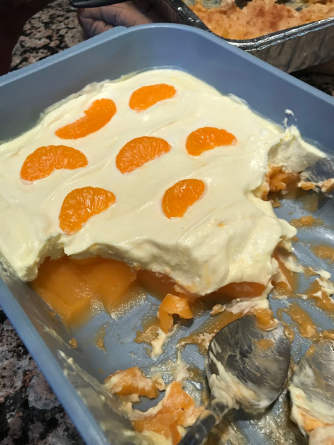 Make 1 large package of cook and serve lemon pudding as directed on the box. Mix 1 small package of orange jello with 1 cup of boiling water and then stir it into the lemon pudding. Put in a smaller 9×13 pan and let sit until firm.