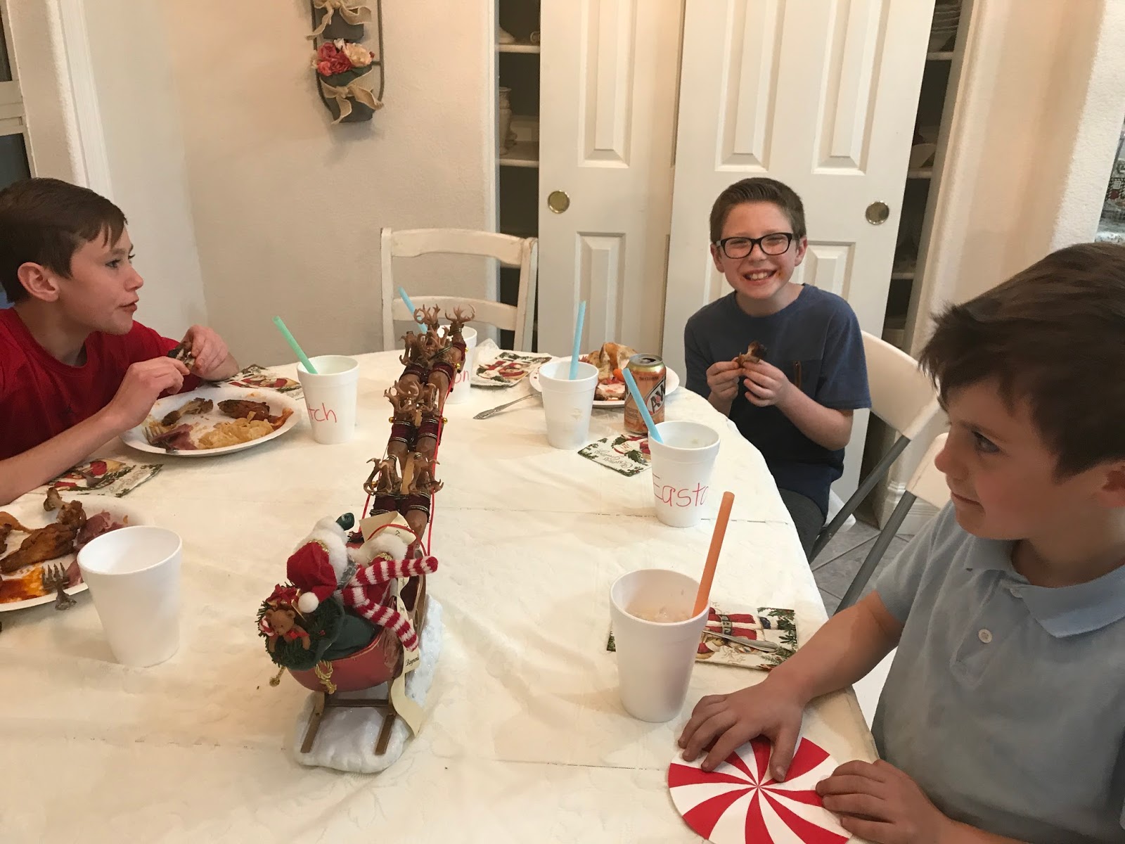 * Opening presents on the decorated kitchen table,