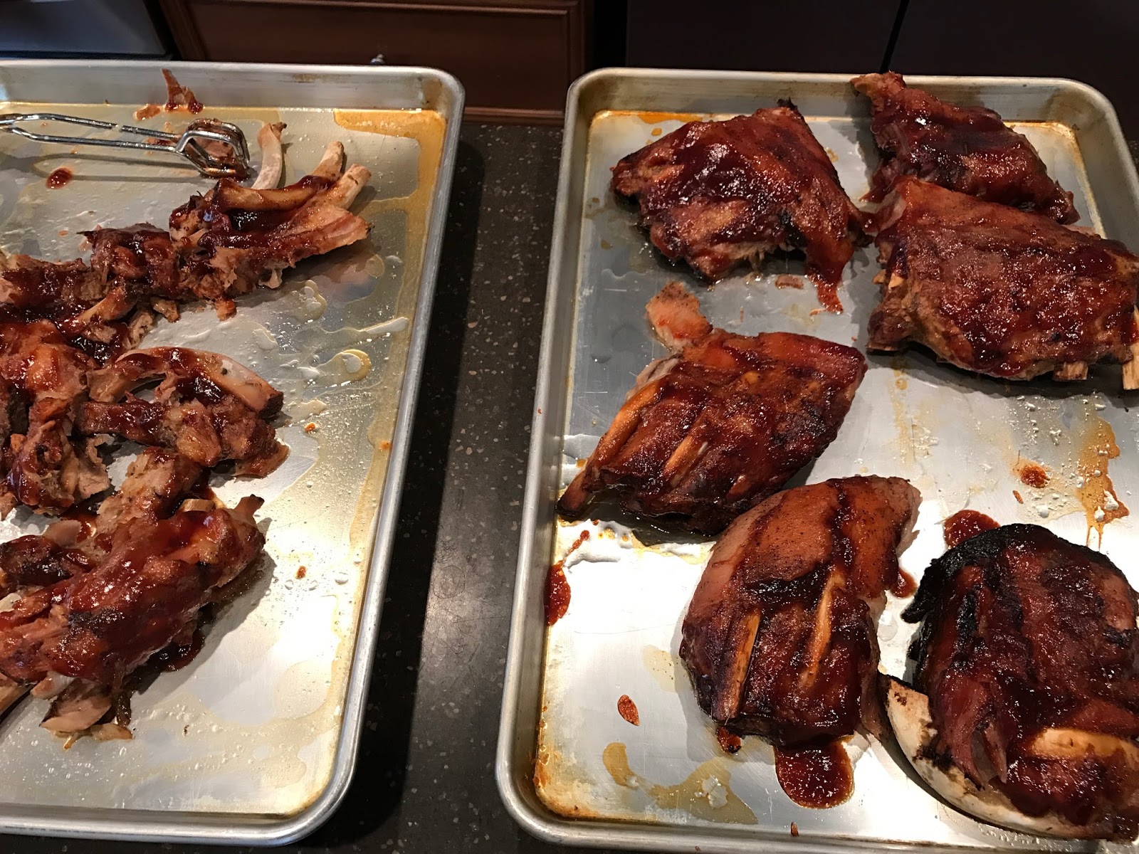 We put them into a crockpot and generously salt and peppered them. {My friend puts Paprika on them but we didn’t have any.} I then covered the bottom of the crockpot with apple juice {probably like 2 cups worth} and let them cook on low all day. After about 8 hours, I took them out {they were so tender they were seriously falling off of the bone} and then put them onto a cookie sheet, basted them with BBQ sauce and then broiled them for about 5 minutes.