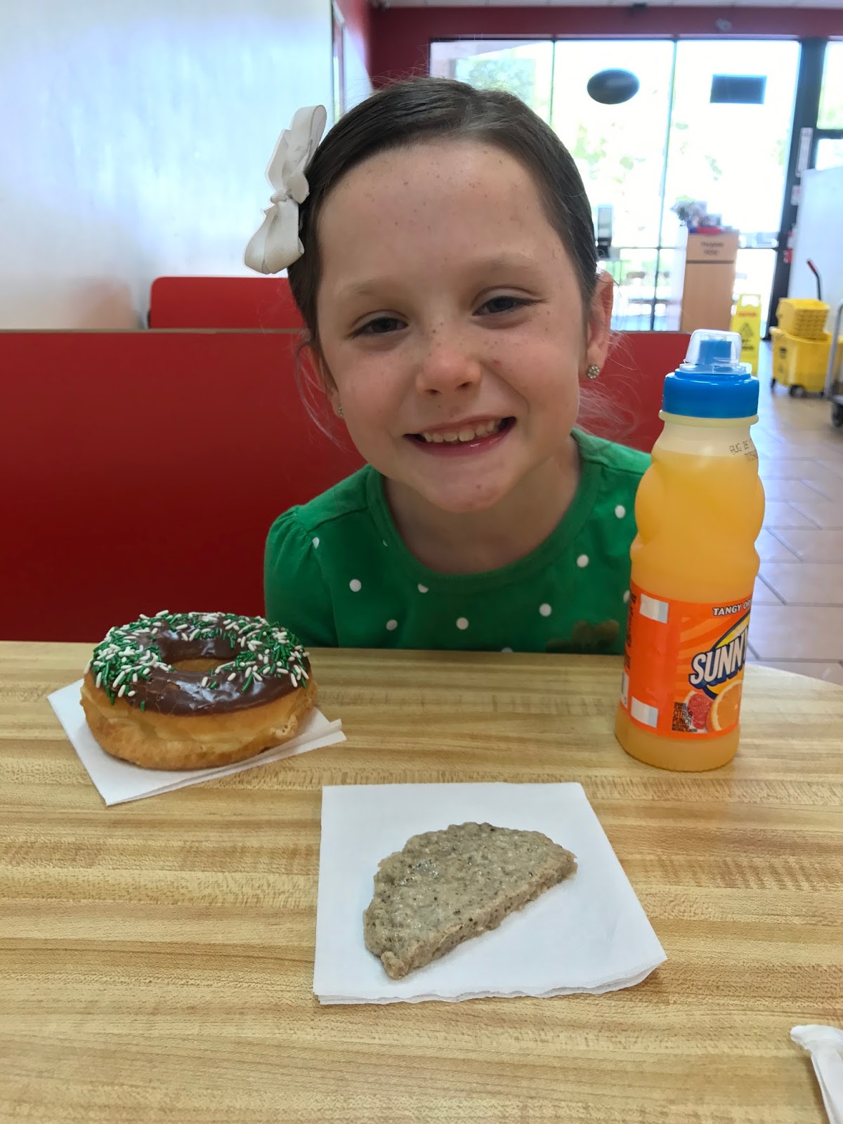 London’s usual: A donut with sprinkles, a Sunny D and a side of sausage from my breakfast sandwich.