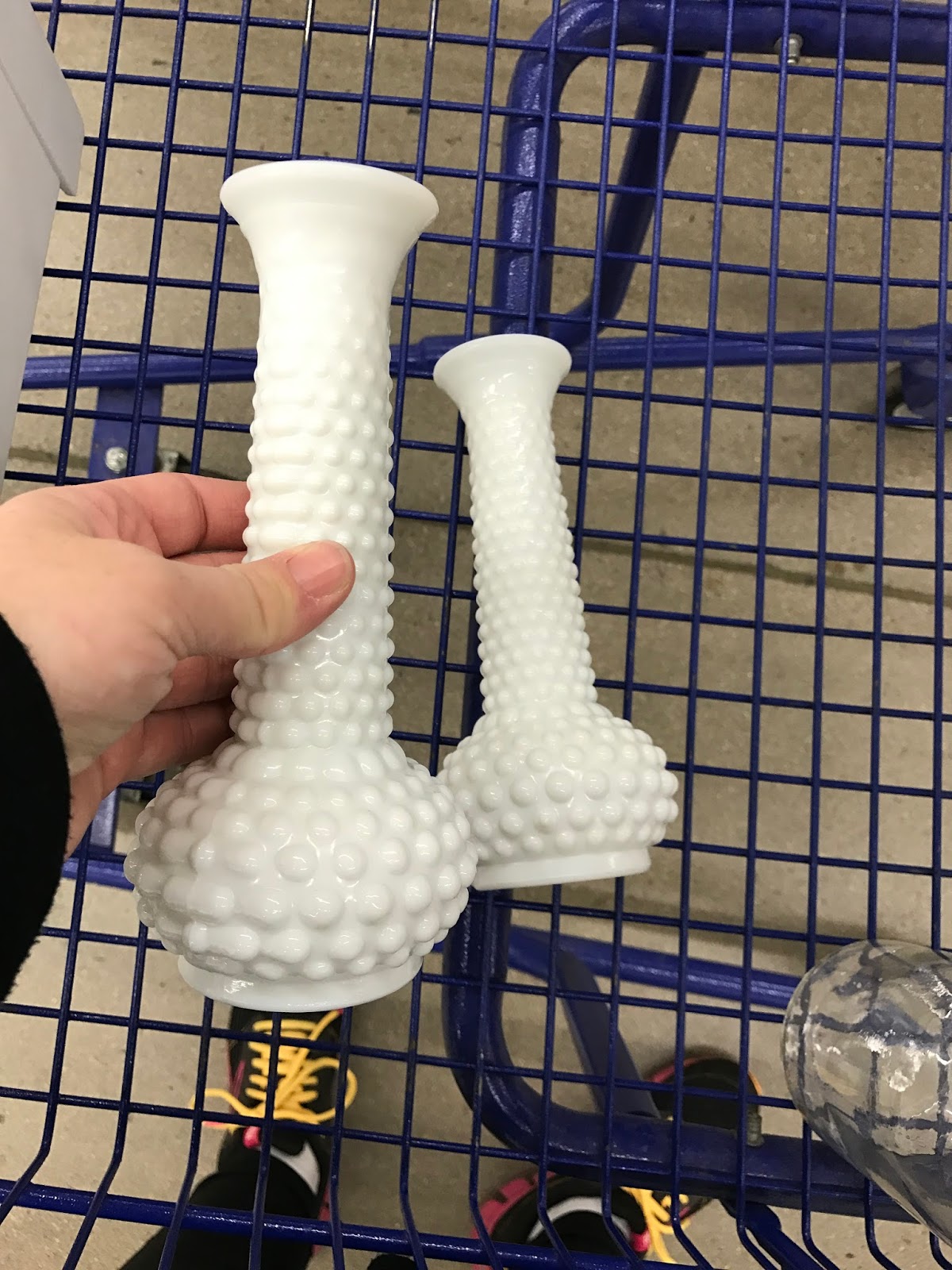 I did score myself some knobby milk glass vases in the end for only $1.49 each so seeing that nasty corndog in the beginning might have just been worth it afterall.