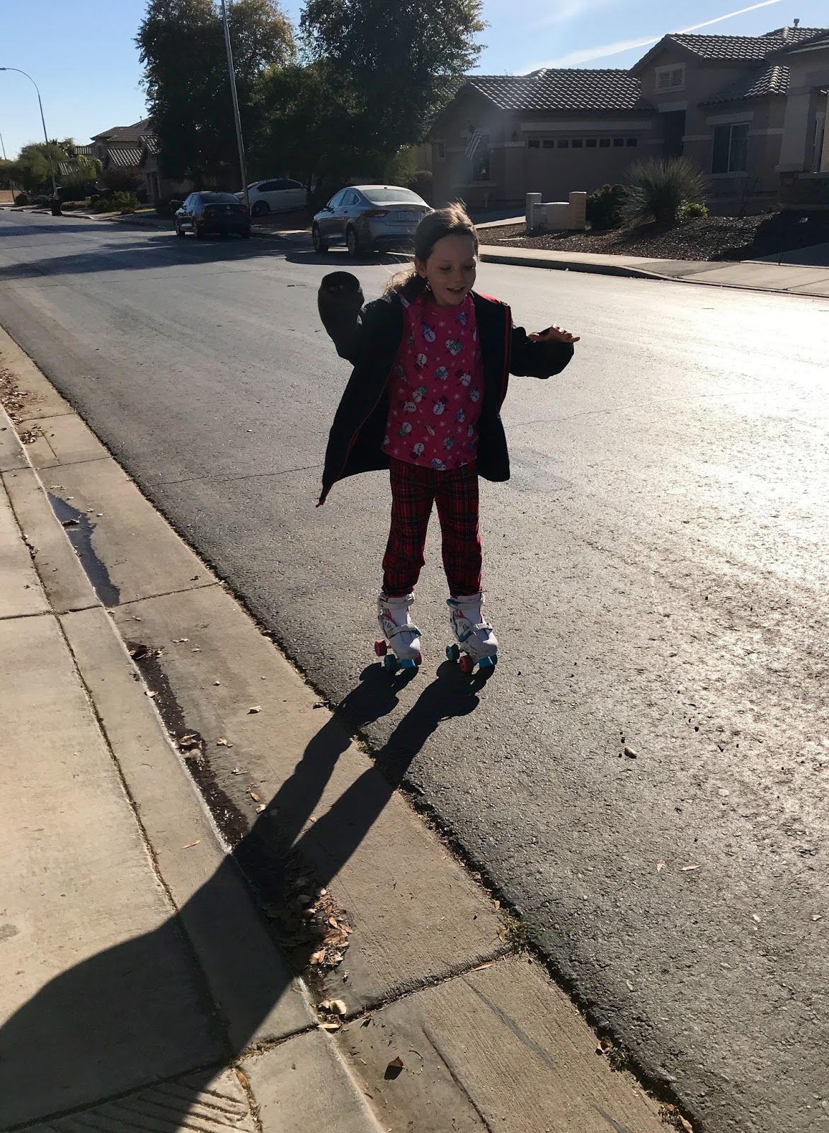 * Saturday morning walk with Cubby and our newest roller-skater….