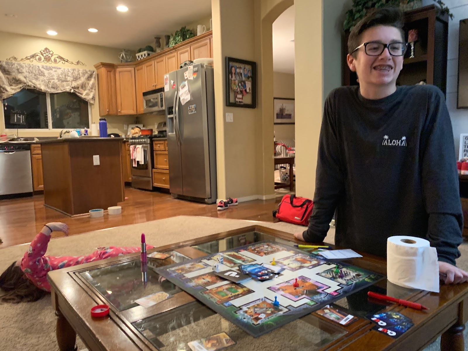 Why is London sprawled out on the floor? And why is there a random roll of toilet paper on the coffee table?