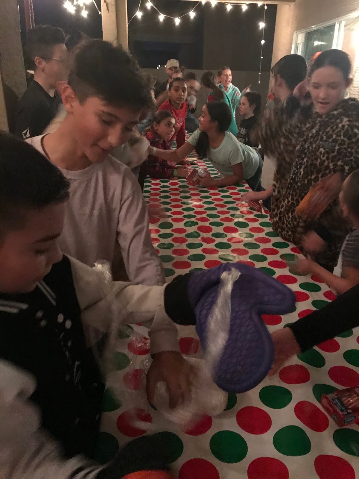 They ate pizza, exchanged white elephant gifts and un-wrapped the big ‘ole, sticky, tricky Saran Wrap ball to find all of the goodies in side!