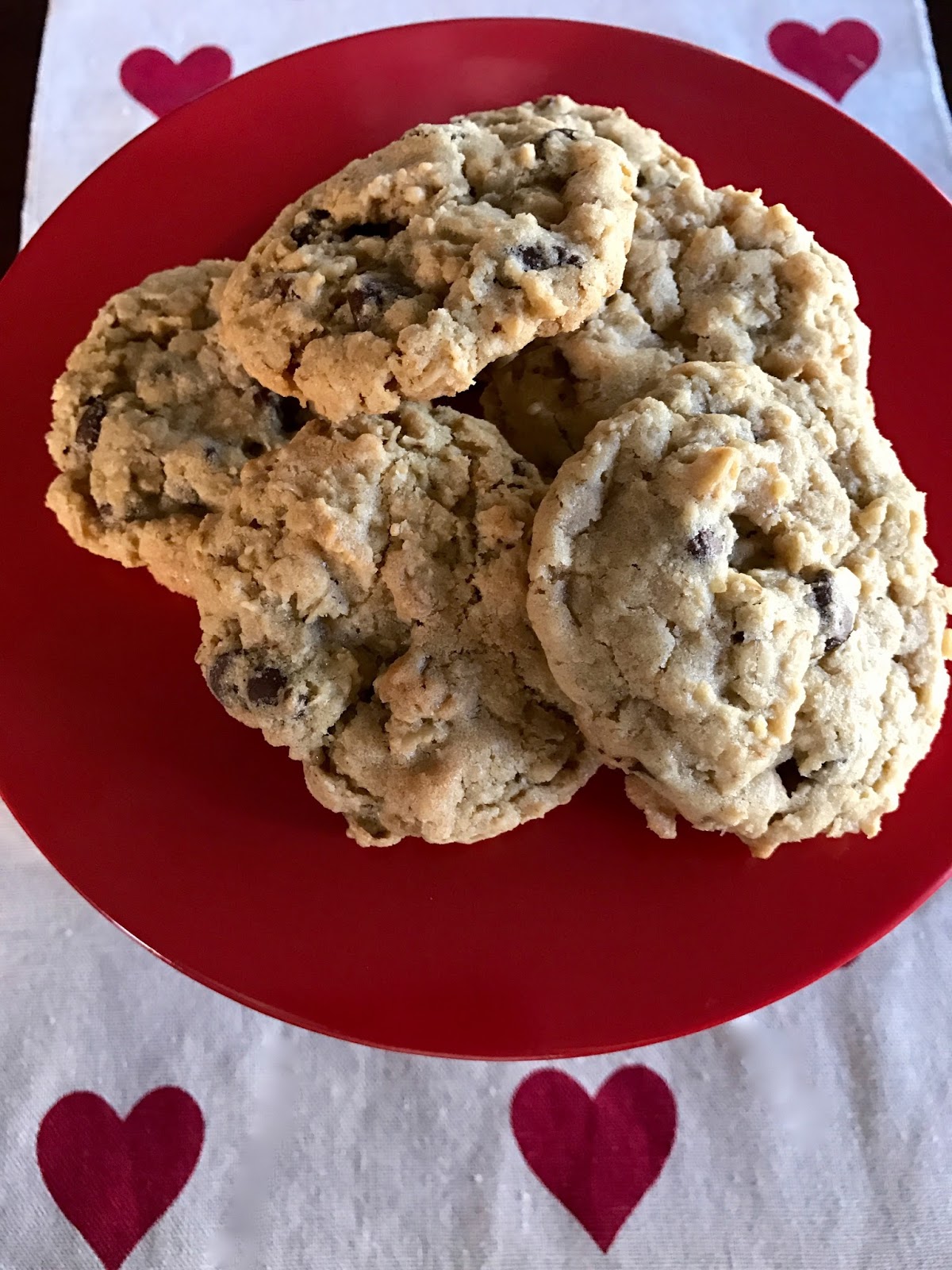 Beat shortening, sugars, eggs and vanilla. Add flour, baking soda, salt and oats. Mix in chocolate chips.